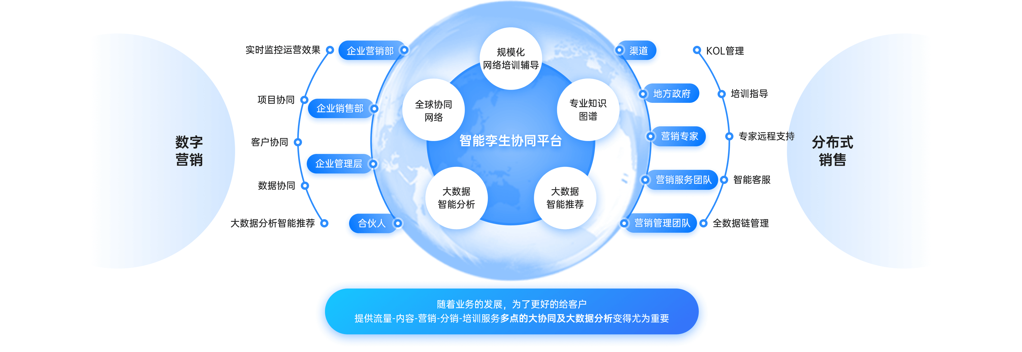 通过智能孪生协同平台,服务于区域政府、企业、服务商的生态。为区域和产业提供数字营销赋能服务,手把手教会企业将营销部门实现数字化转型,为区域细分产业提供所需人才培育和输出服务;为企业客户提供流量-内容-营销-分销-培训多点大协同及大数据分析服务;
