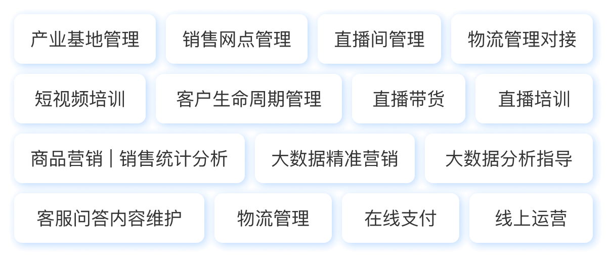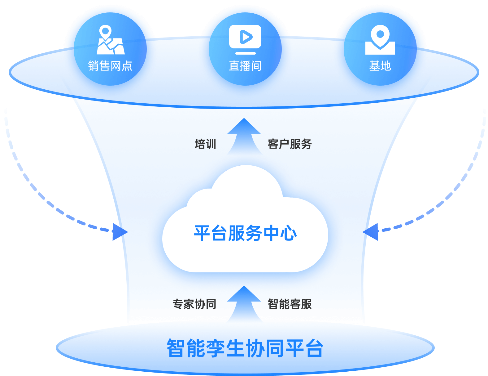 通过智能孪生协同平台,各区域特色产业基地,各区域销售网点,直播间连起来。 总部智能大脑提供培训、客户服务的平台工具,区域内互联互通,统一培训、服务、运营、管理,为数字营销和分布式销售服务平台运营保障。