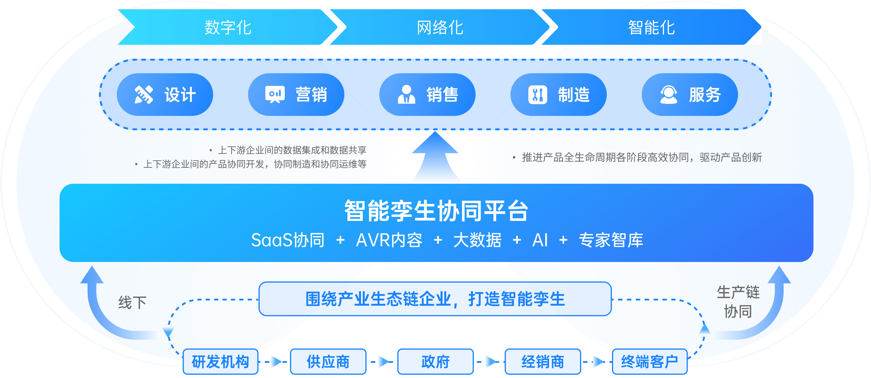 让服务商共享专家资源,通过大数据智能分析,为客户提供基于产品与场景数字孪生的项目协同客户协同、渠道协同、文档协同、远程专家支持、远程培训指导、智能客服等高效大协同服务。